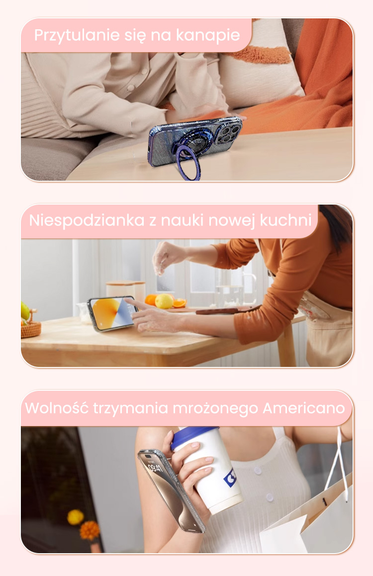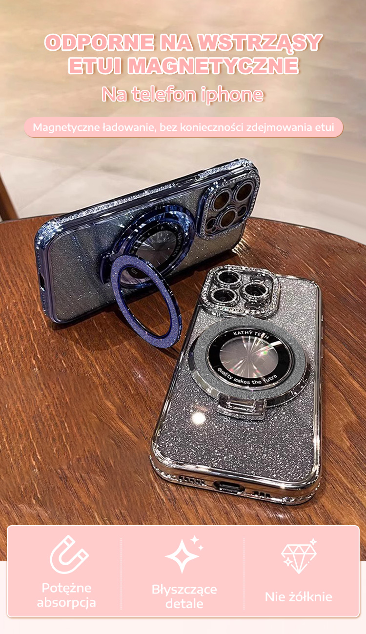 Magnetyczne etui na iPhone'a z brokatowymi dżetami i niewidoczną podstawką